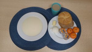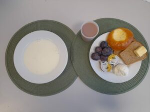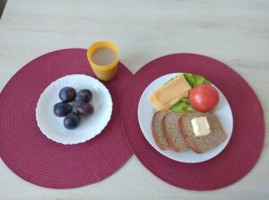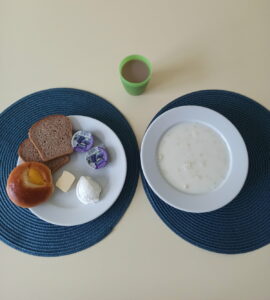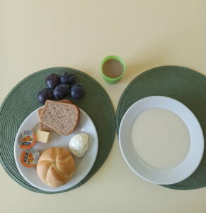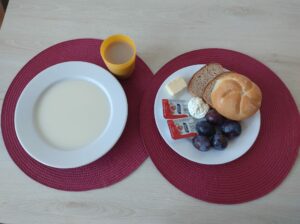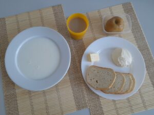 Kasza manna na mleku 400ml, Chleb graham 70g, Bułka pszenno-żytnia 50g 1szt., Masło 83%tł. 20g, Twarożek 50g, Dżem truskawkowy 25g 2szt., Śliwka 180g, Kawa zbożowa z mlekiem z/c 250ml