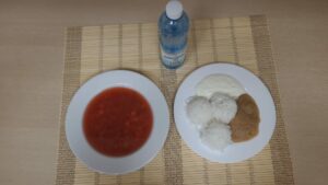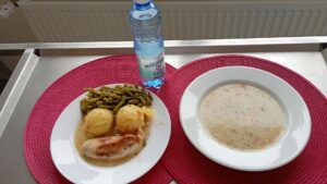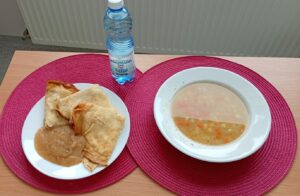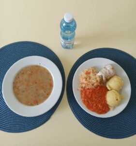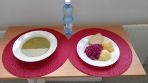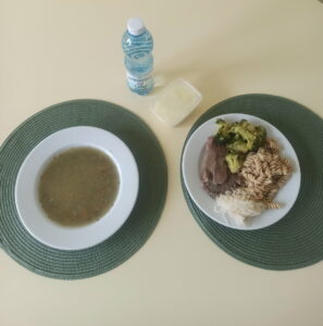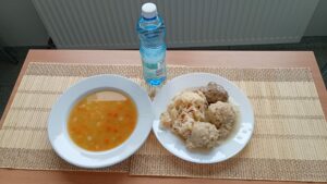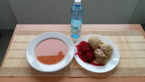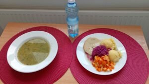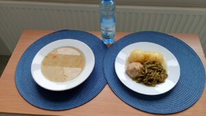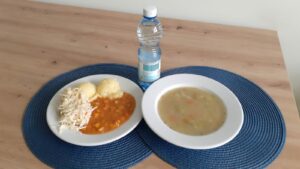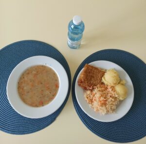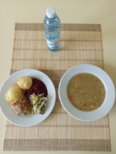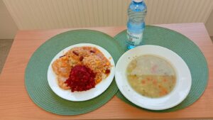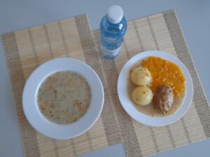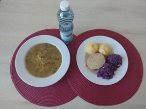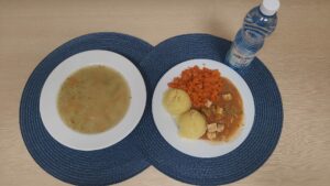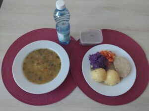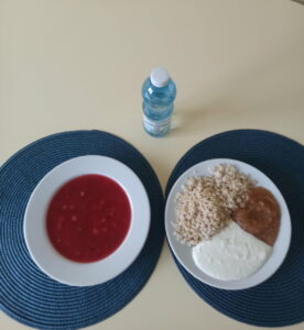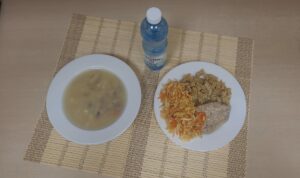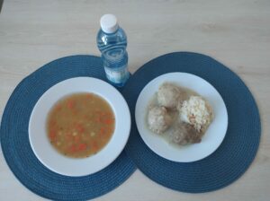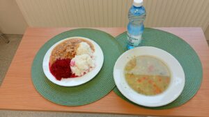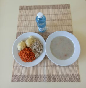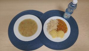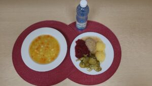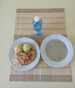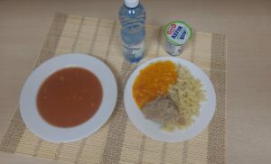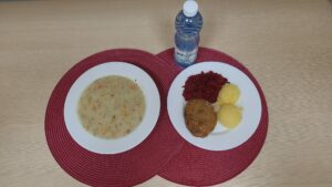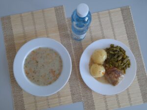 Zupa z soczewicy z ziemniakami 400ml, Ziemniaki gotowane 200g, Zrazik drobiowy z udźca gotowany mielony 100g, Buraczki podprawiane drobno tarte bez cukru 100g, Ogórek kiszony z cebulką z olejem 100g, Woda mineralna n/g 0,5l 1szt.