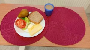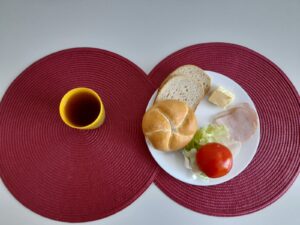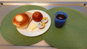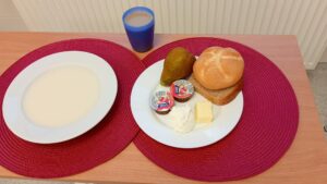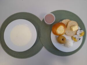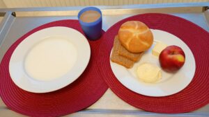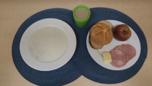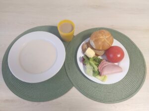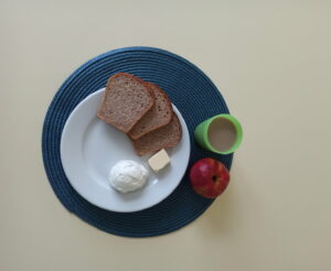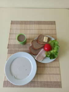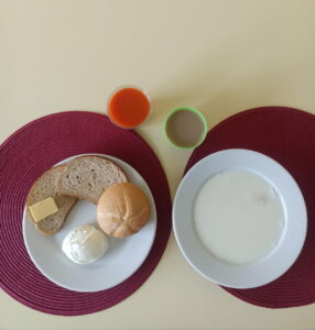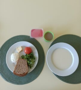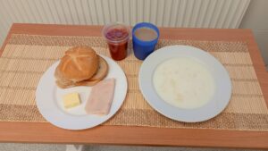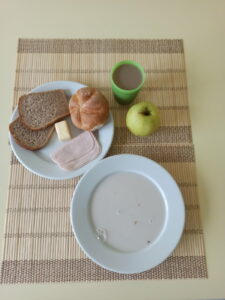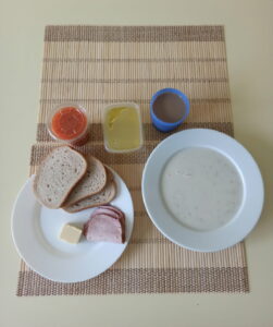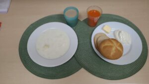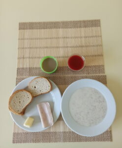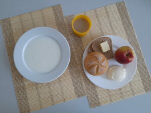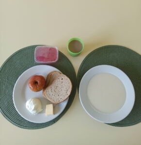 Kasza manna na mleku 400ml, Chleg graham 70g, Bułka pszenno-żytnia 50g 1szt., Masło 83%tł. 20g, Dżem wiśniowy 60g, Jabłko 150g, Kawa zbożowa z mlekiem z/c 250ml
