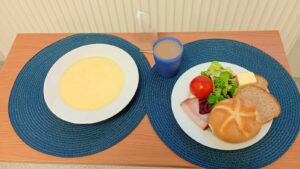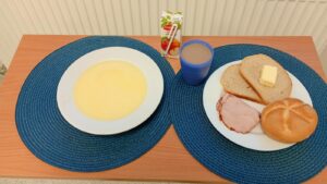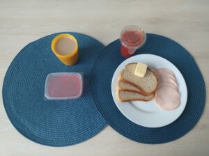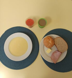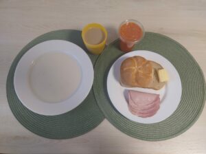 Kasza kukurydziana na mleku 400ml, Chleb mieszany pszenno-żytni 50g, Bułka pszenno-żytnia 50g 1szt., Masło 83%tł. 20g, Szynka Piastowska wieprzowa wędzona...60g, Sok marchwiowy 200ml, Kawa zbożowa z mlekiem z/c 250ml