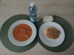 Barszcz biały z ziemniakami 400ml, Risotto z mięsem wieprzowym i warzywami 350g, Sos pomidorowy 100ml, Surówka z selera i jabłka z olejem 200g, Kompot owocowy z jabłkiem z/c 250ml