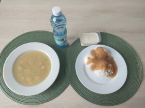 Kalafiorowa z ryżem 400 ml, Ziemniaki 200g, Ryba pieczona Morszczuk 100g, Surówka z kapusty kiszonej z olejem 100g, Warzywa po grecku 100g, Kompot owocowy z jabłkami b/c 250ml Podwieczorek: Kasza manna z jabłkiem prażonym 250g