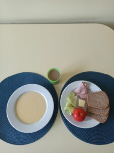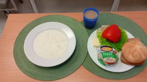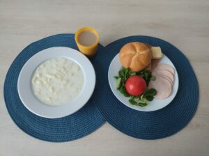 Zacierka na mleku 400ml, Chleb graham 70g, Bułka pszenno-żytnia 50g 1szt., Masło 83% tł. 20g, Serek śniadaniowy ze szczypiorkiem 80g 1 szt., Papryka świeża 80g, Sałata zielona 20g, Kawa zbożowa z mlekiem z/c 250ml