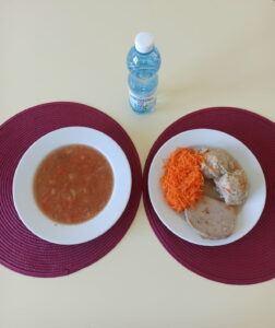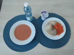 Jarzynowa z makaronem 400m, Ziemniaki gotowane 200g, Pulpet drobiowy 100g, Sos pietruszkowy 100ml, Marchew gotowana z olejem 200g, Woda mineralna n/g 0,5l 1szt.