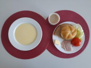 Zacierka na mleku 400ml, Chleb graham 70g, Bułka pszenno-żytnia 50g 1szt., Masło 83%tł. 20g, Serek śniadaniowy ze szczypiorkiem 80g 1szt., Pomidor 80g, Sałata zielona 20g, Kawa zbożowa z mlekiem z/c 250ml