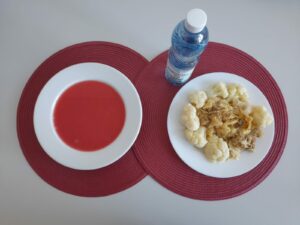 Kalafiorowa z ryżem 400ml, Ziemniaki 200g, Ryba pieczona Morszczuk 100g, Surówka z kapusty kiszonej z olejem 100g, Warzywa po grecku 100g, Kompot owocowy z jabłkami b/c 250ml Podwieczorek: Kasza manna z jabłkiem prażonym b/c 250g