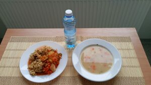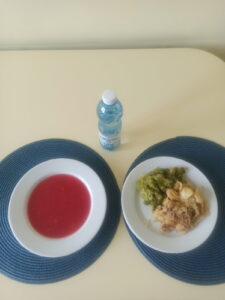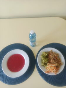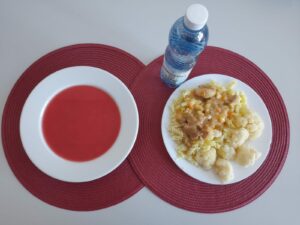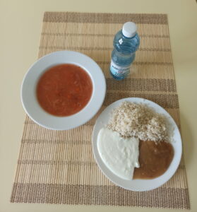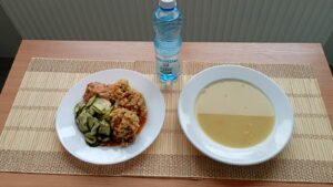 Brokułowa z ziemniakami 400ml, Ryż na sypko 200g, Bitka z szynki wieprzowej duszona 100g, Sos meksykański 100g, Surówka z selera i jabłka z olejem b/c 100g, Buraczki gotowane 100g, Woda mineralna n/g 0,5l 1szt.