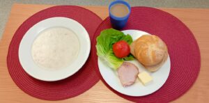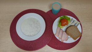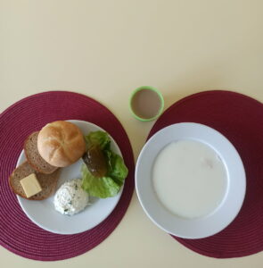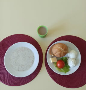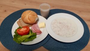 Zacierka na mleku 400ml, Chleb graham 70g, Bułka pszenno-żytnia 50g 1szt., Masło 83%tł. 20g, Serek śniadaniowy ze szczypiorkiem 80g 1szt., Papryka świeża 80g, Sałata lodowa 20g, Kawa zbożowa z mlekiem z/c 250ml