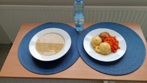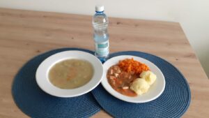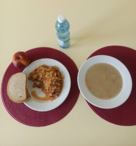 Brokułowa z ryżem 400ml, Ziemniaki 200g, Gulasz warzywny z ciecierzycą 200g, Surówka z marchwi 200g, Kompot owocowy z jabłkami z/c 250ml