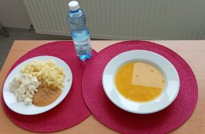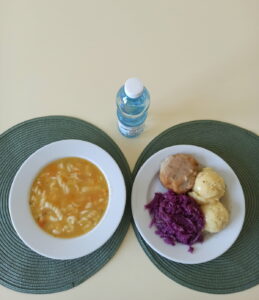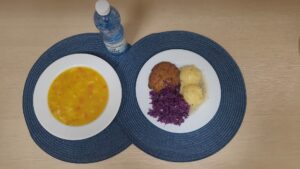 Dyniowa z makaronem 400ml, Ziemniaki gotowane 200g, Kotlet z ryby Morszczuk 100g, Sos pietruszkowy 100ml, Sałatka z kapusty czerwonej z olejem 200g, Woda mineralna n/g 0,5l 1szt.