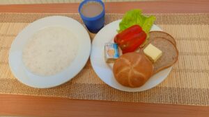 Płatki owsiane na mleku 400ml, Chleb graham 70g, Bułka pszenno-żytnia 50g 1szt., Masło 83%tł. 20g, Ser topiony 50g, Papryka świeża 80g, Sałata zielona 20g, Kawa zbożowa z mlekiem z/c 250ml