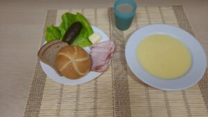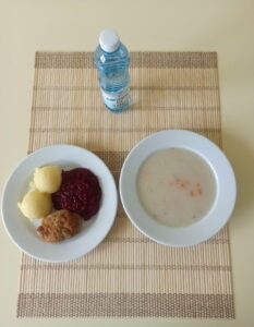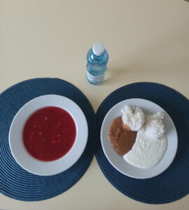 Grysikowa 400 ml, Ziemniaki 200g, Zrazik drobiowy z udźca gotowany mielony 100g, Sos jarzynowy 100ml, Buraczki podprawiane-drobno tarte b/c 100g, Ogórek kiszony z cebulką z olejem 100g, Kompot owocowy z jabłkami b/c 250ml Podwieczorek: Budyń o smaku waniliowym b/c 200ml zamiana na jogurt naturalny 150g 1szt.