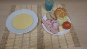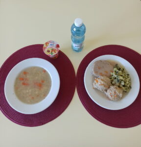 Brokułowa z ryżem 400ml, Ziemniaki 200g, Jajko gotowane kl M 2szt., Sos koperkowy 100ml, Marchew gotowana z olejem 200g, Kompot owocowy z olejem z/c 250ml