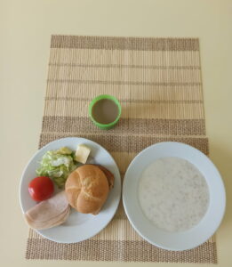 Płatki jęczmienna na mleku 400ml, Chleb mieszany pszenno-żytni 50g, Bułka pszenno-żytnia 50g 1szt., Masło 83%tł. 20g, Pierś delikatna z kurnej półki...60g, Sok wielowarzywny pasteryzowany 200ml, Kawa zbożowa z mlekiem z/c 250ml