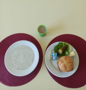 Płatki pszenne na mleku 400ml, Chleb graham 70g, Bułka pszenno-żytnia 50g 1szt., Masło 83%tł. 20g, Szynkowa dębowa kiełbasa wieprzowa...50g, Ogórek kiszony 80g, Sałata zielona 20g,Kawa zbożowa z mlekiem z/c 250ml