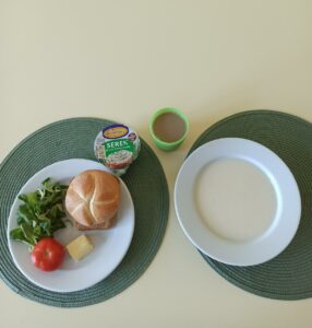 Chleb graham 70g, Bułka pszenno-żytnia 50g 1szt., Masło 83%tł. 20g, Serek homo.o smaku naturalnym z ziołami 100g, Pomidor 80g, Sałata zielona 20g, Kawa zbożowa z mlekiem b/c 250ml