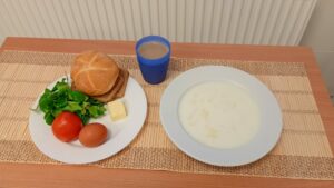 Zacierka na mleku 400ml, Chleb mieszany pszenno-żytni 50g, Bułka pszenno-żytnia 50g 1 szt., Masło 83%tł. 20g, Pasta z twarogu z koperkiem 100g, Pomidor 80g, Sałata zielona 20g, Kawa zbożowa z mlekiem z/c 250ml