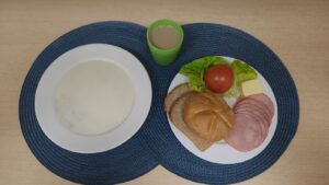 Płatki pszenne na mleku 400ml, Chleb graham 70g, Bułka pszenno-żytnia 50g, Masło 83%tł. 20g, Szynka pieczona w ogniu wieprzowa...50g, Ogórek świeży 80g, Sałata zielona 20g, Kawa zbożowa z mlekiem z/c 250ml