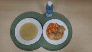 Barszcz biały z ziemniakami 400ml, Kaszotto jęczmienne z mięsem wieprzowym i warzywami 350g, Sos pomidorowy 100ml, Sałatka szwedzka 100g, Cukinia pieczona z olejem100g, Woda mineralna n/g 0,5l 1szt.