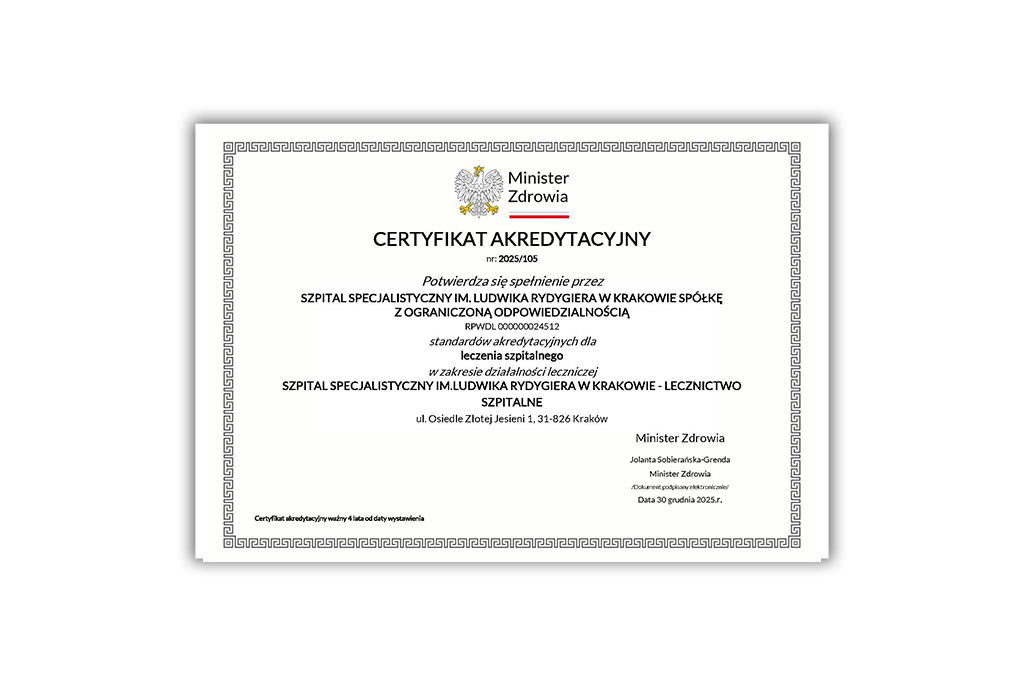 Wysoka pozycja Szpitala Rydygiera w rankingach polskich i zagranicznych placówek medycznych to potwierdzenie poziomu i jakości świadczonych usług oraz uznanie dla przyjętej strategii zarządczej. W wymagającym procesie akredytacyjnym, któremu w grudniu 2025 r. poddanych zostało jedynie 9 szpitali w Polsce, Rydygier uzyskał wynik 90% punktów sumowanych ze wszystkich 220 nowych standardów i jest jedną z trzech placówek medycznych, którym udało się przejść wieloetapową procedurę weryfikacyjną z najwyższym pułapem punktów akredytacyjnych. Komisja akredytacyjna wysoko oceniła standardy szpitala w utrzymywaniu bezpieczeństwa i efektywności stosowanej farmakoterapii, działań w zakresie prewencji i kontroli zakażeń, a także poziom bezpieczeństwa Pacjentów, co wiąże się z minimalizowaniem ryzyka wystąpienia zdarzeń niepożądanych oraz standardy leczenia żywieniowego, poziom cyfryzacji i bezpieczeństwo informacji.